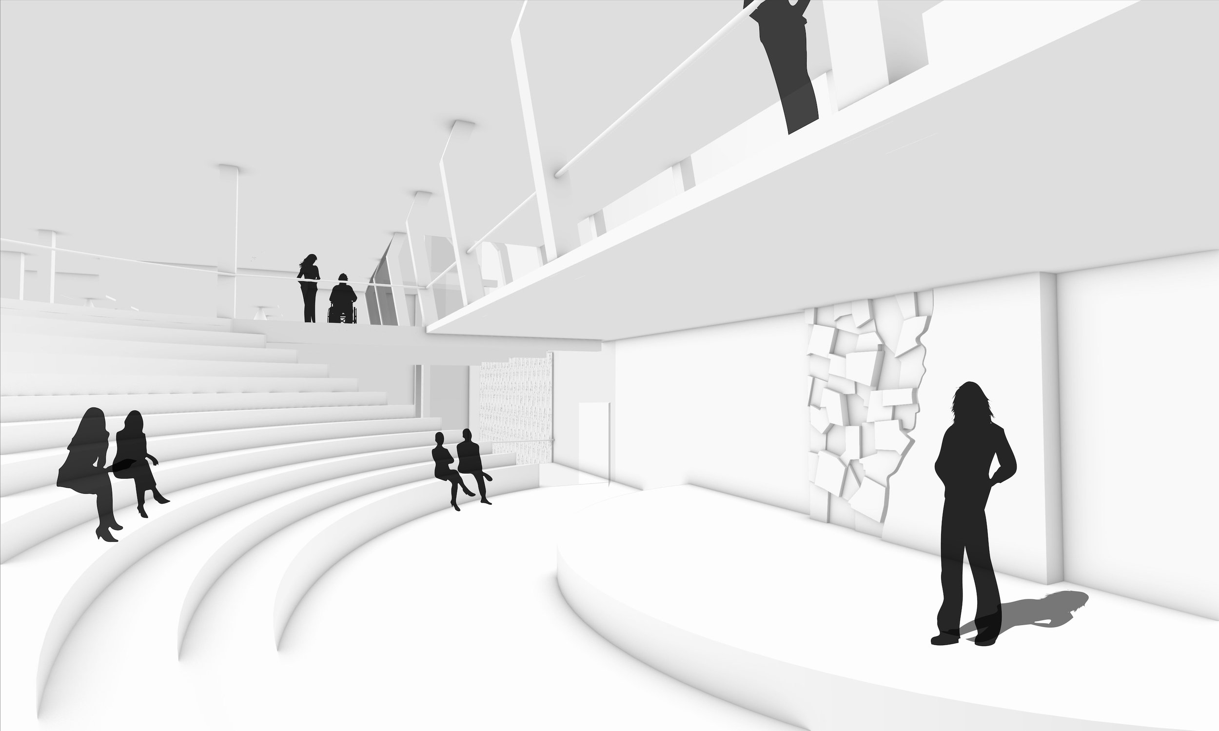 For the performance space's stage floor, I designed a tile that embodies the same tension. Half follows the borders of the towns in the region; the other half, separated by the river, remains untouched. After modeling the tile in Rhino, I CNC-milled a 1/8th scale version from foam. A flexible LED light placed in the river valley represents the infusion of life into both sides of the divide.